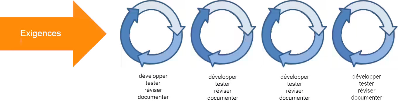 Le travail est organisé en sprints ou itérations, c’est-à-dire que le développement est réparti en périodes de plus en plus réduites au fur et à mesure des cycles, jusqu’à ce que le projet prenne fin. Chaque sprint comprend une phase de développement, de test, de révision et de documentation d’une fonctionnalité.